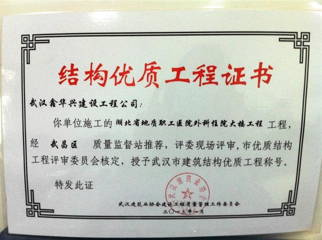 近日,鑫華興公司承建的湖北省地質(zhì)職工醫(yī)院外科住院大樓工程,經(jīng)武昌區(qū)質(zhì)量監(jiān)督站推薦,評(píng)委現(xiàn)場(chǎng)評(píng)審,市優(yōu)質(zhì)結(jié)構(gòu)工程評(píng)審委員會(huì)核定,被授予“武漢市建筑結(jié)構(gòu)優(yōu)質(zhì)工程”稱號(hào)。