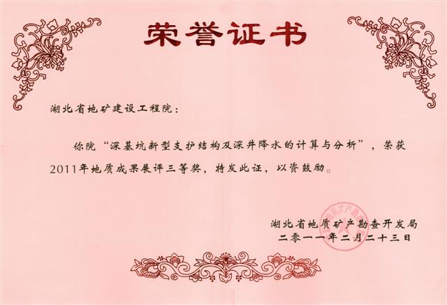 全局34項(xiàng)地質(zhì)成果參加了地質(zhì)成果展評(píng), 29項(xiàng)成果參加評(píng)選,(包括工程院選送的“湖北省工程建設(shè)工法的開(kāi)發(fā)”成果在內(nèi)的5項(xiàng)成果因近兩年在省局或省廳獲過(guò)獎(jiǎng)而不參加本次評(píng)獎(jiǎng)),共評(píng)出壹等獎(jiǎng)2項(xiàng),貳等獎(jiǎng)4項(xiàng),叁等獎(jiǎng)8項(xiàng)。由工程院選送的“新型基礎(chǔ)工程施工工藝研究”成果榮獲貳等獎(jiǎng),“深基坑新型支護(hù)結(jié)構(gòu)及深井降水的計(jì)算與分析” 成果榮獲叁等獎(jiǎng)。