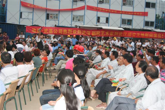 2011年7月14日晚,江岸區(qū)總工會在武漢地質(zhì)勘察基礎工程有限公司瑞安A1A2A3地塊樁基項目施工現(xiàn)場舉辦慰問一線職工文藝演出。來自武漢劇院藝術(shù)家們表演的舞蹈、獨唱、雜技、魔術(shù)、川劇變臉等一個個精彩紛呈的節(jié)目,博得了一陣陣熱烈的掌聲。特別是當演員們走下臺來與觀眾互動,邀請觀眾對唱時,現(xiàn)場氣氛更是鼎沸歡騰。