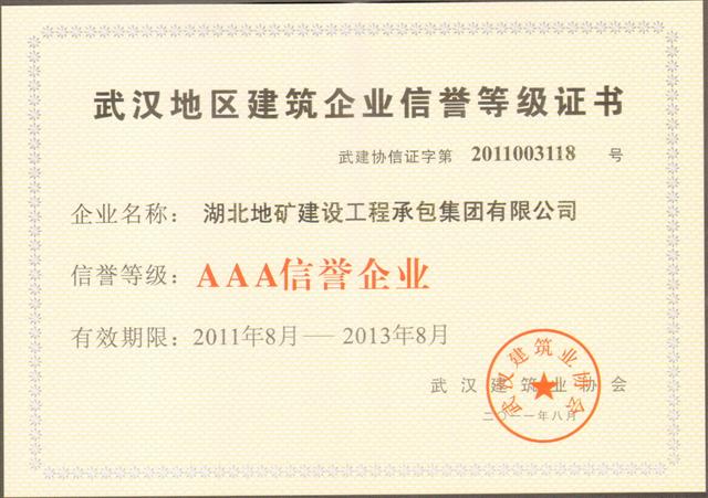 2011年8月26日,武漢建筑業(yè)協(xié)會公布了2011年武漢地區(qū)建筑業(yè)企業(yè)信譽等級評定結(jié)果,湖北地礦建設(shè)工程承包集團有限公司再次被評為“武漢地區(qū)建筑業(yè)AAA級信譽企業(yè)”。