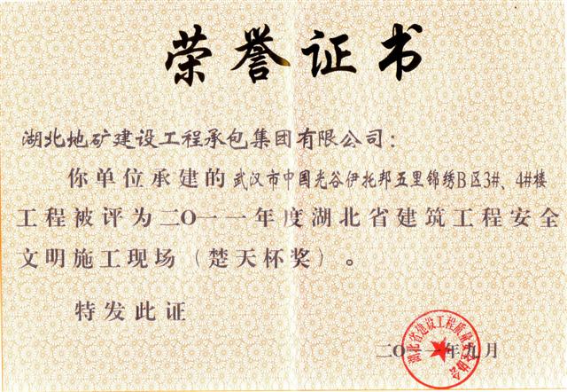 據(jù)悉,“安全文明施工現(xiàn)場(楚天杯)”獎是湖北省建筑行業(yè)安全文明施工的最高榮譽獎項,目的在于鼓勵建筑施工企業(yè)搞好安全文明施工,提高全省建筑施工安全生產(chǎn)水平。該獎項的評定是從建設、施工、監(jiān)理等方面,對項目現(xiàn)場進行全方位考評。 另訊,日前收到湖北省住房和城鄉(xiāng)建設廳文件《關于公布2010-2011年度第一批湖北省建筑結構優(yōu)質(zhì)工程名單的通知》(鄂建文〔2011〕61號),地建承包公司承建的湖北國土資源職業(yè)學院漢南新校區(qū)圖文中心工程和鄂東北地質(zhì)大隊孝感基地經(jīng)濟適用房工程名列其中。