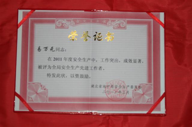 2011年度,武基公司積極推行安全標(biāo)準(zhǔn)化管理,安全生產(chǎn)工作取得了較好的成績。3月16日,在湖北省地礦局2012年度安全工作會議上,公司被授予“2011年度湖北省地礦局安全生產(chǎn)先進單位” 榮譽稱號,公司總經(jīng)理易萬元同志被授予 “2011年度湖北省地礦局安全生產(chǎn)先進工作者”榮譽稱號。