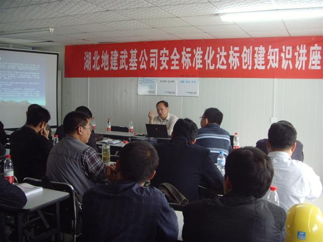 4月17日,武基公司在武漢綠地中心樁基施工項目部舉辦了一期安全標(biāo)準(zhǔn)化達(dá)標(biāo)創(chuàng)建知識講座。局工程地質(zhì)處副處長周興和應(yīng)邀進(jìn)行了授課,武基公司領(lǐng)導(dǎo)、各工程處班子成員、專職安全員、技術(shù)員和施工員40余人參加了講座。