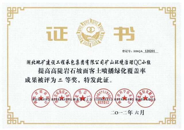 武基公司鉆進(jìn)QC小組《提高旋挖鉆機(jī)嵌巖施工效率》成果被評為二等獎,勘察公司礦山環(huán)境治理QC小組《提高高陡巖石坡面客土噴播綠化覆蓋率》成果被評為三等獎,地建承包公司新星小組《附著式升降腳手架安全防護(hù)新工藝施工》被評為優(yōu)等獎。武基公司鉆進(jìn)QC小組、勘察公司礦山環(huán)境治理QC小組和地建承包公司新星小組均被評為“湖北省優(yōu)秀質(zhì)量管理小組”。