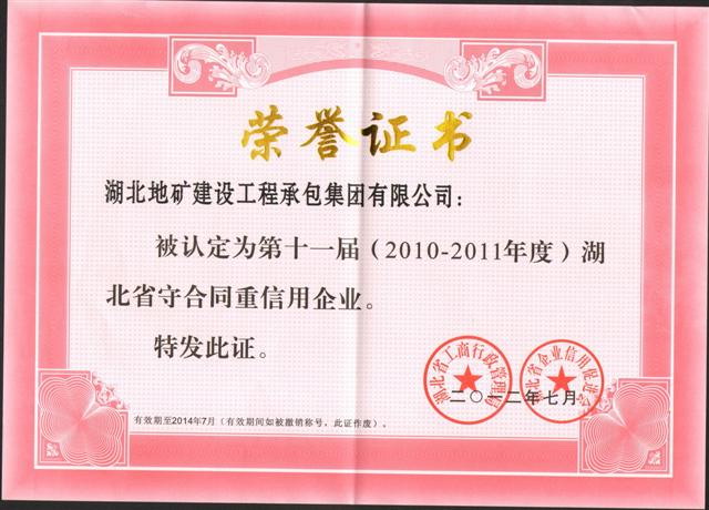 近日,地建承包公司和武基公司均被湖北省工商行政管理局、湖北省企業(yè)信用促進(jìn)會授予第十一屆(2010-2011年度)湖北省守合同重信用企業(yè)。