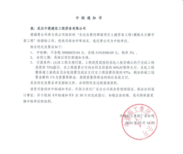 2024年,公司堅持經(jīng)營創(chuàng)新,織密內(nèi)合外聯(lián)“互聯(lián)網(wǎng)”,不斷加強與大型央企國企等優(yōu)質(zhì)客戶緊密協(xié)作,與中建科工、中建三局公司建立戰(zhàn)略合作關(guān)系,大力開拓廣州區(qū)域市場,近日成功中標(biāo)全運會黃村兩館項目土建勞務(wù)+模板木方及架體搭設(shè)項目、康王路隧道安置房項目樁基礎(chǔ)及基坑支護工程,合同金額共計約4000萬元。全運會黃村兩館項目是中楚公司全面參與建筑勞務(wù)市場化競爭的里程碑項目,康王路隧道基礎(chǔ)項目是公司進一步拓展廣東地域市場的項目,相關(guān)項目對公司轉(zhuǎn)型發(fā)展及市場布局具有重要意義。