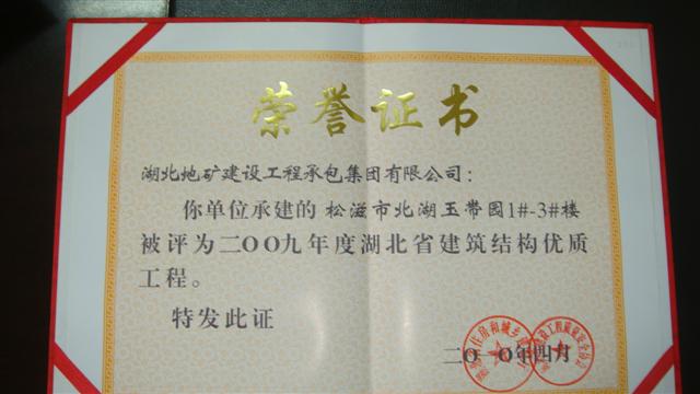 近日,在2009年度湖北省建筑結(jié)構(gòu)優(yōu)質(zhì)工程評選活動(dòng)中,由湖北地建承包公司承建的松滋市北湖玉帶園1#-3#樓被湖北省住房和城鄉(xiāng)建設(shè)廳、湖北省建設(shè)工程質(zhì)量安全協(xié)會(huì)評為“2009年度湖北省建筑結(jié)構(gòu)優(yōu)質(zhì)工程”。