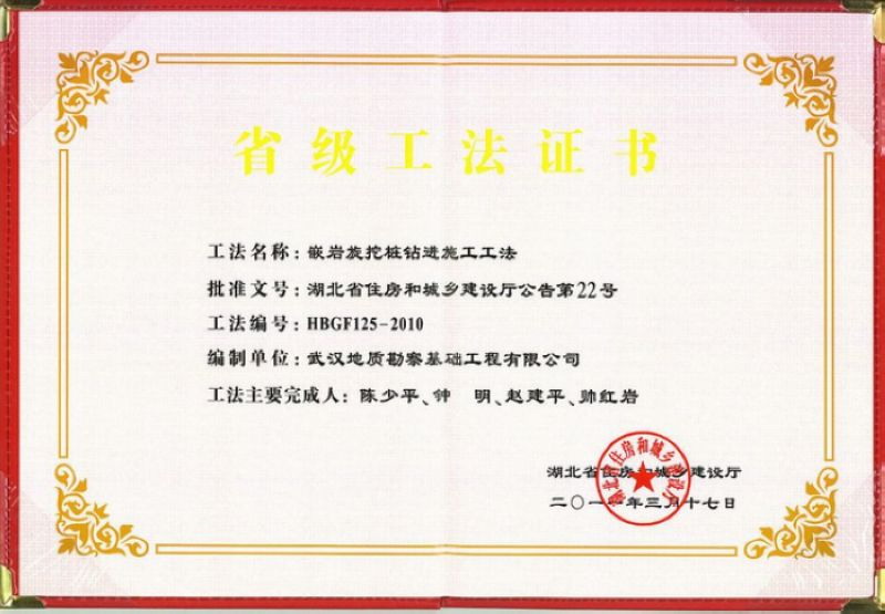近日,由湖北地建·武基公司負(fù)責(zé)編制的嵌巖旋挖樁鉆進(jìn)施工工法,被湖北省住房和城鄉(xiāng)建設(shè)廳批準(zhǔn)為省級(jí)工法。